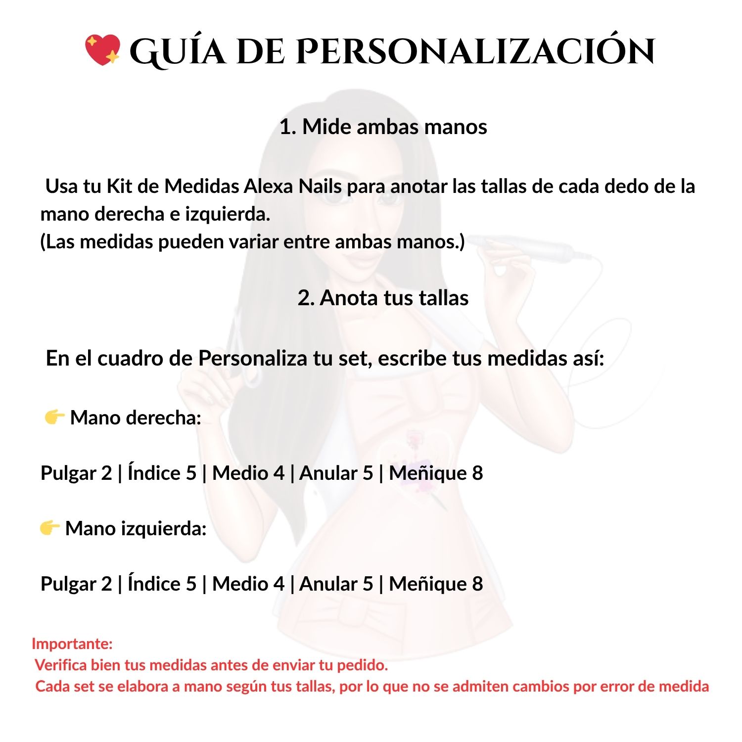 Usa tu Kit de Medidas Alexa Nails para anotar las tallas de cada dedo de la mano derecha e izquierda.